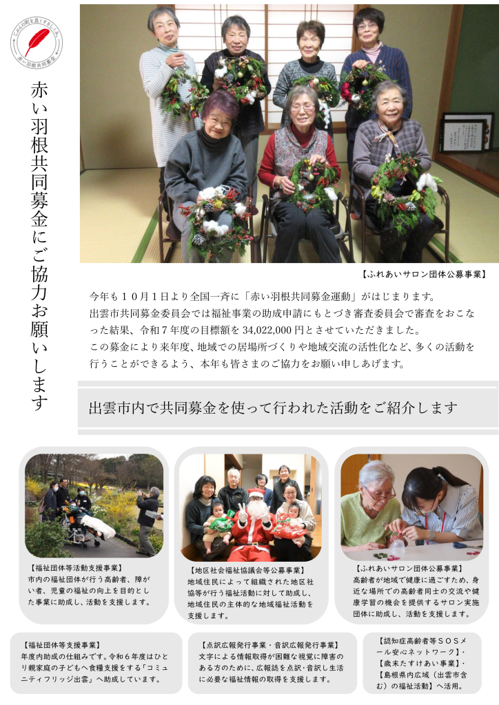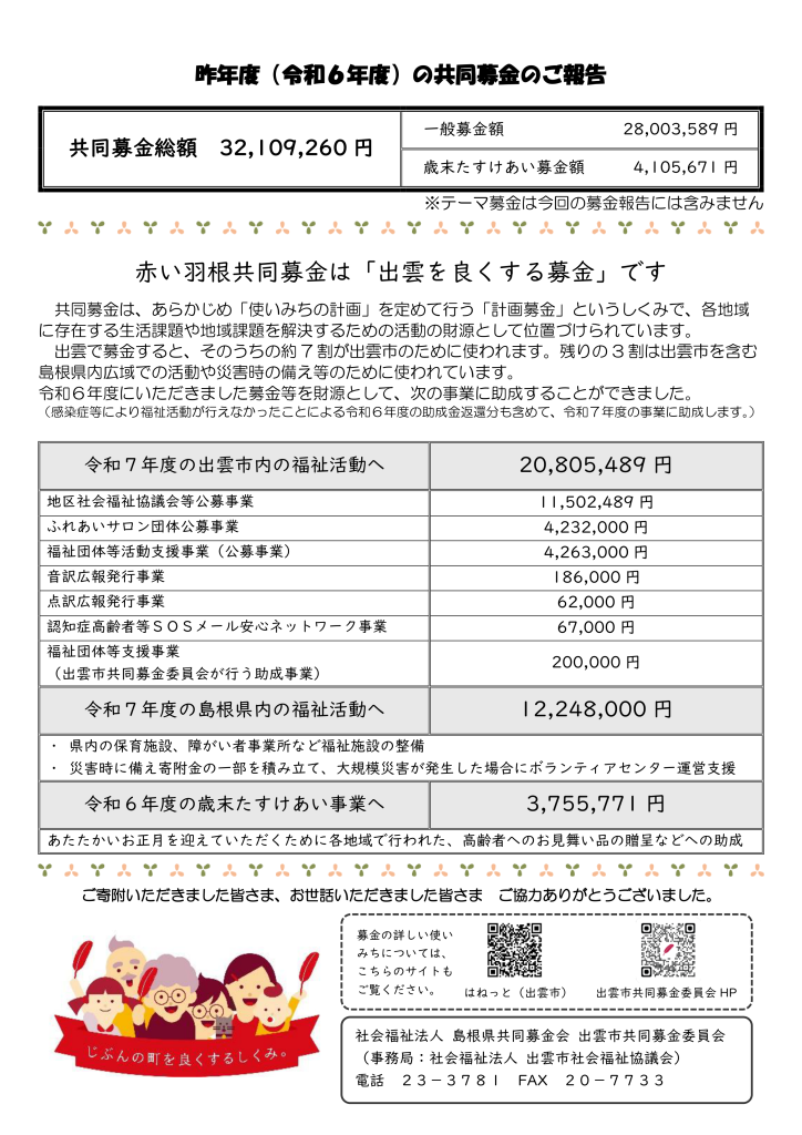 皆さまから寄せられた善意は、地域の福祉活動に有効に使わせていただきますので、引き続きご理解とご協力をいただきますよう、よろしくお願いいたします。