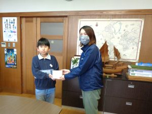 これは、運営委員会のみなさんが登下校時に募金箱を持って呼びかけ、生徒の一人ひとりから集めて下さったものです。児童から「ぼくたちの住む出雲市のために使ってください」との言葉がありました。